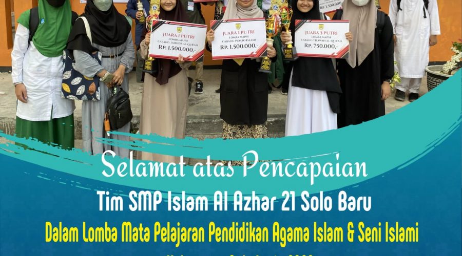 Senyum tersungging dari wajah murid dan guru SMP Islam Al Azhar 21 yang pada hari Kamis tanggal 29 September mengikuti Lomba Mata Pelajaran Pendidikan Agama Islam dan Seni Islami (MAPSI). Kebahagiaan terpancar karena berhasil membawa 6 piala dari 12 mata lomba. Piala yang berhasil dibawa pulang diantaranya Juara 1 Lomba MTQ Putra diraih oleh ananda Hilmy Widan dari kelas 9D, sementara Juara 3 MTQ Putri diraih oleh ananda Jauza Nadhifa...Read More
